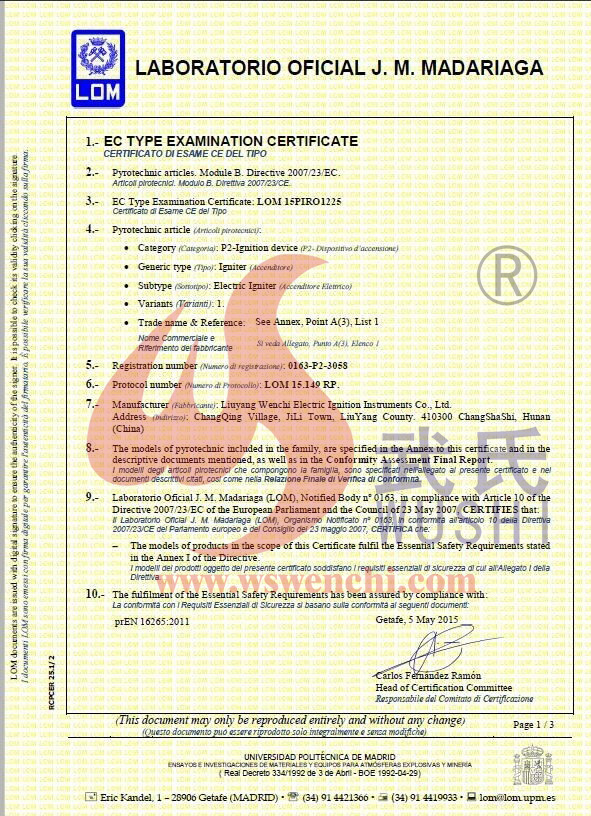 瀏陽市文馳電點(diǎn)火具有限公司(原培文電子點(diǎn)火器材廠),創(chuàng)建于1998年,是一家專業(yè)從事研制銷售電子點(diǎn)火產(chǎn)品的民營科技企業(yè),是我國第1枚煙花用電點(diǎn)火頭生產(chǎn)者,是《煙花爆竹電點(diǎn)火頭國標(biāo)》牽頭起草單位。公司位于中國“煙花之鄉(xiāng)”湖南省瀏陽市,地理位置優(yōu)越,交通便利。 我公司研制的對象是用電能引燃火藥、做機(jī)械功等預(yù)定功能的一次性使用的元件或裝置,包括電點(diǎn)火頭(英文名ElectricMatch or Electric Igniter,中文俗稱“電火柴”或“電發(fā)火頭”)、電點(diǎn)火管和延期電點(diǎn)火管;我們估且在以后的產(chǎn)品技術(shù)欄中將我們研究的產(chǎn)品統(tǒng)稱為電點(diǎn)火具,將電點(diǎn)火器看成是用于提供和控制供給電點(diǎn)火元件點(diǎn)火的電能器材;我們研究的電點(diǎn)火橋路有橋絲式、無橋絲···